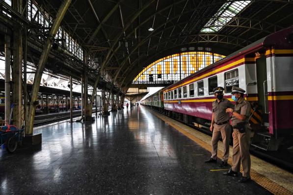 Voyage Voyage Terminus pour la gare historique de Bangkok (en images) Avec ses vitraux bleutés, orange et vert, la gare historique de Bangkok se prêtait à la rêverie des départs mais plus aux ambitions logistiques d'une mégalopole de 10 millions d'habitants: l'essentiel de ses activités ferroviaires vont être détournées huit kilomètres plus loin.