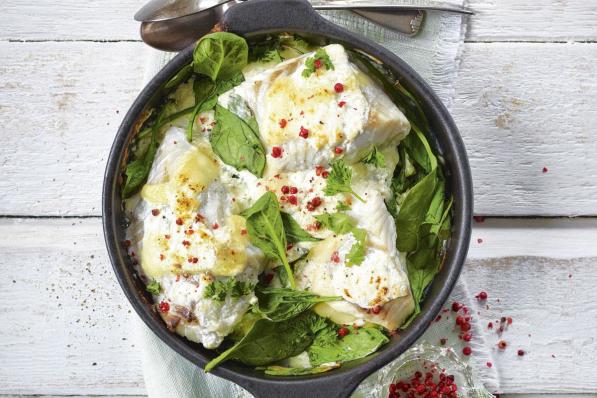 Culinaire Culinaire Recette de Lieu noir aux épinards et à la mozzarella Pour 4 pers. - 20 min. ? 4 filets de lieu noir ? 2 grosses poignées d'épinards frais ? 3 boules de mozzarella de bufflonne ? 50 ml de vin blanc sec ? 2 c. à c. de poivre rose en grains ? 4 c. à s. d'huile d'olive