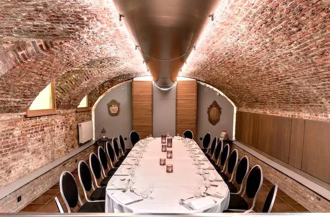 Institution incontournable de la haute gastronomie bruxelloise, l’établissement tenu aujourd’hui par Laurence Wynants et Lionel Rigolet peut se targuer de posséder non pas une, mais plusieurs salles privatisables. Parmi elles, une élégante table d’hôtes située dans la cuisine (pouvant accueillir jusqu’à 26 personnes), un sublime salon boisé au rez-de-chaussée (une table ovale pour 2 à 10 convives) ou encore un splendide espace dans leur cave à vins (entre 8 et 12 personnes maxi) baptisé Riwyne, en hommage aux noms des propriétaires. Pour les plus grands groupes, l’établissement dispose d’autres salles privatisables à l’étage.