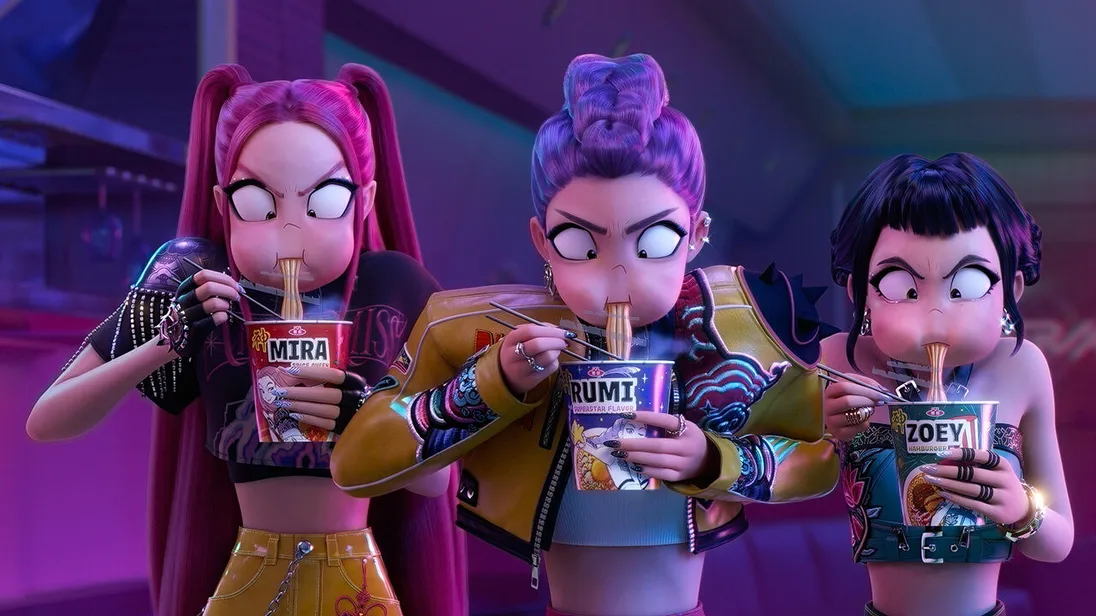 Chaque star a son rituel avant de monter sur scène. Beyoncé s’installe dans un fauteuil de massage. Selena Gomez avale une cuillère d’huile d’olive. Et Rumi, Mira et Zoey, les membres de HUNTR/X – un groupe de K-pop doublé d’une équipe de chasseuses de démons – mangent du ramyeon. Dans KPop Demon Hunters, film d’animation devenu le plus visionné de l’histoire de Netflix, les héroïnes fictives engloutissent goulûment leurs nouilles instantanées ultra-épicées. (Netflix s’est d’ailleurs associé à la marque agroalimentaire Nongshim pour lancer une gamme de ramyeon à leur effigie.)