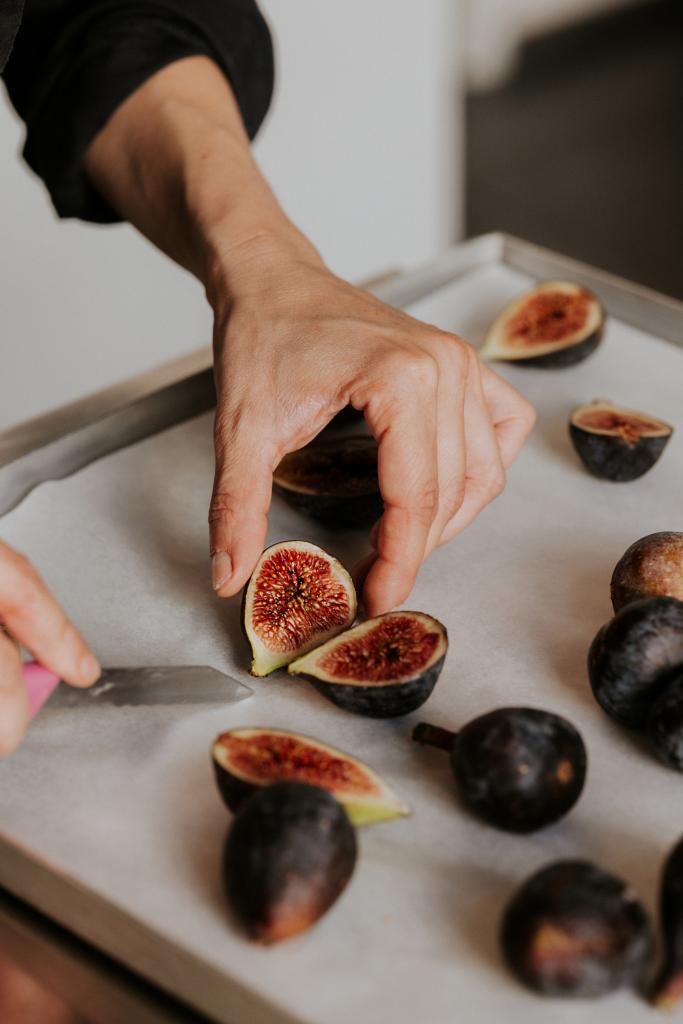Lorsque la tarte est refroidie, utiliser un couteau (spatule) pour étaler la confiture de framboises sur la tarte. Découper les figues en fines tranches, les placer patiemment à la manière des tuiles d’un toit sur toute la surface de la tarte: on réalise des rangées horizontales où chaque nouvelle rangée recouvre partiellement la précédente.