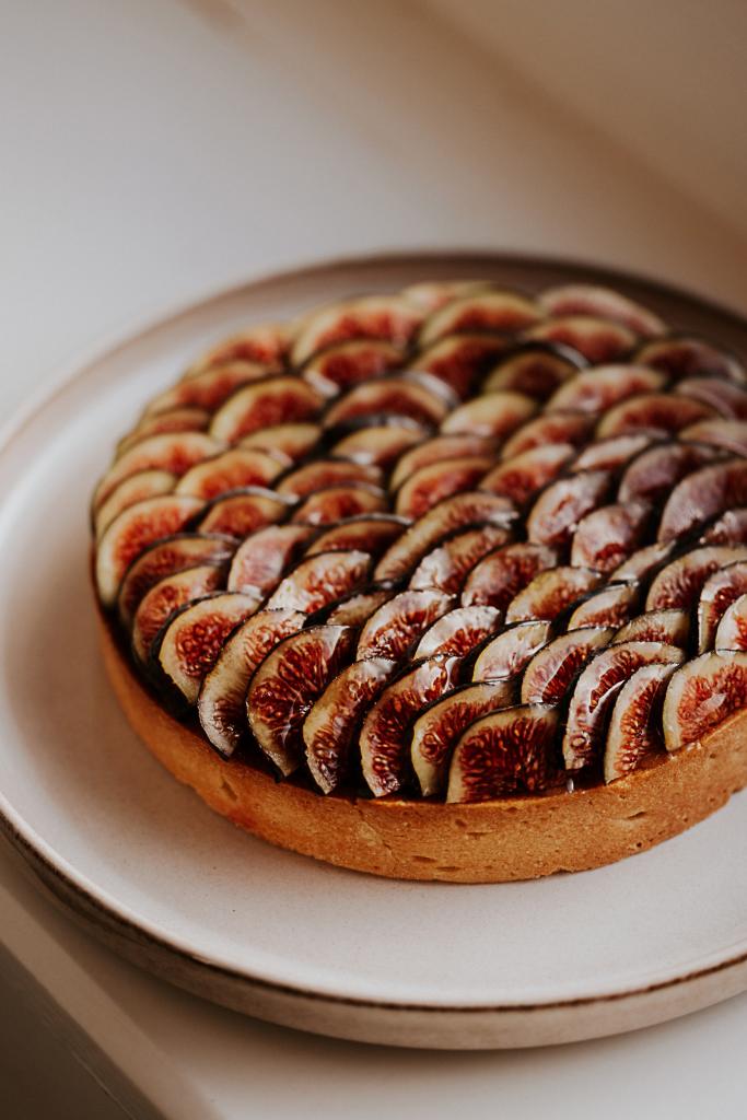 Cette tarte brille par sa simplicité. La pâte croustillante du fond est remplie d’une riche crème aux amandes: une base consistante, rafraîchie par de la confiture de framboises et chapeautée par un séduisant assemblage de fines tranches de figues. Le nappage, tout simple, apporte une touche de brillance. Une fois que l’on maîtrise les techniques de base, on peut expérimenter avec les confitures et les fruits au fil des saisons. En hiver, par exemple, de la confiture d’agrumes surmontée de tranches d’oranges sanguines.