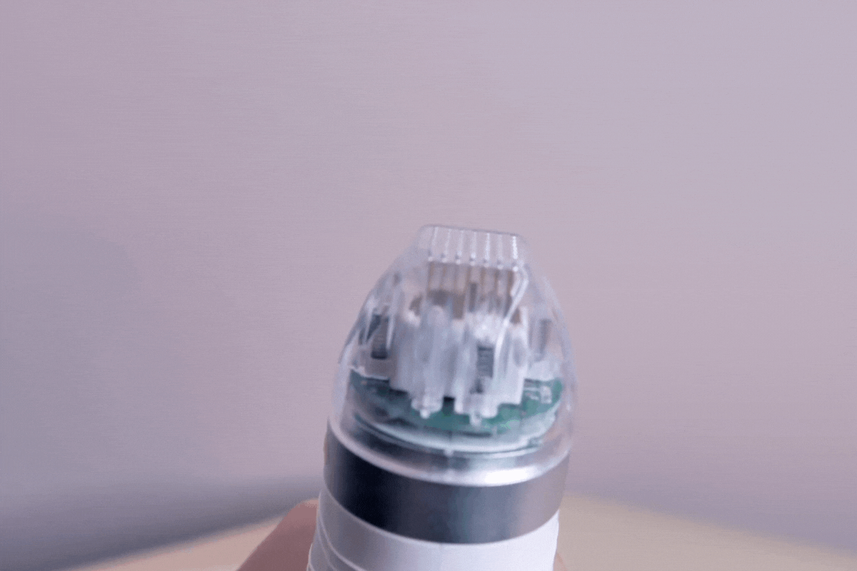 Comment ça marche? L’outil ressemble à une seringue contenant la quantité de traitement à base de niacinamide nécessaire pour six applications. La boîte contient six têtes dotées chacune de dix-huit micropointes de 0,02 mm. La routine manuelle table sur 1.800 stimulations mécaniques. Il s’utilise tous les deux jours.