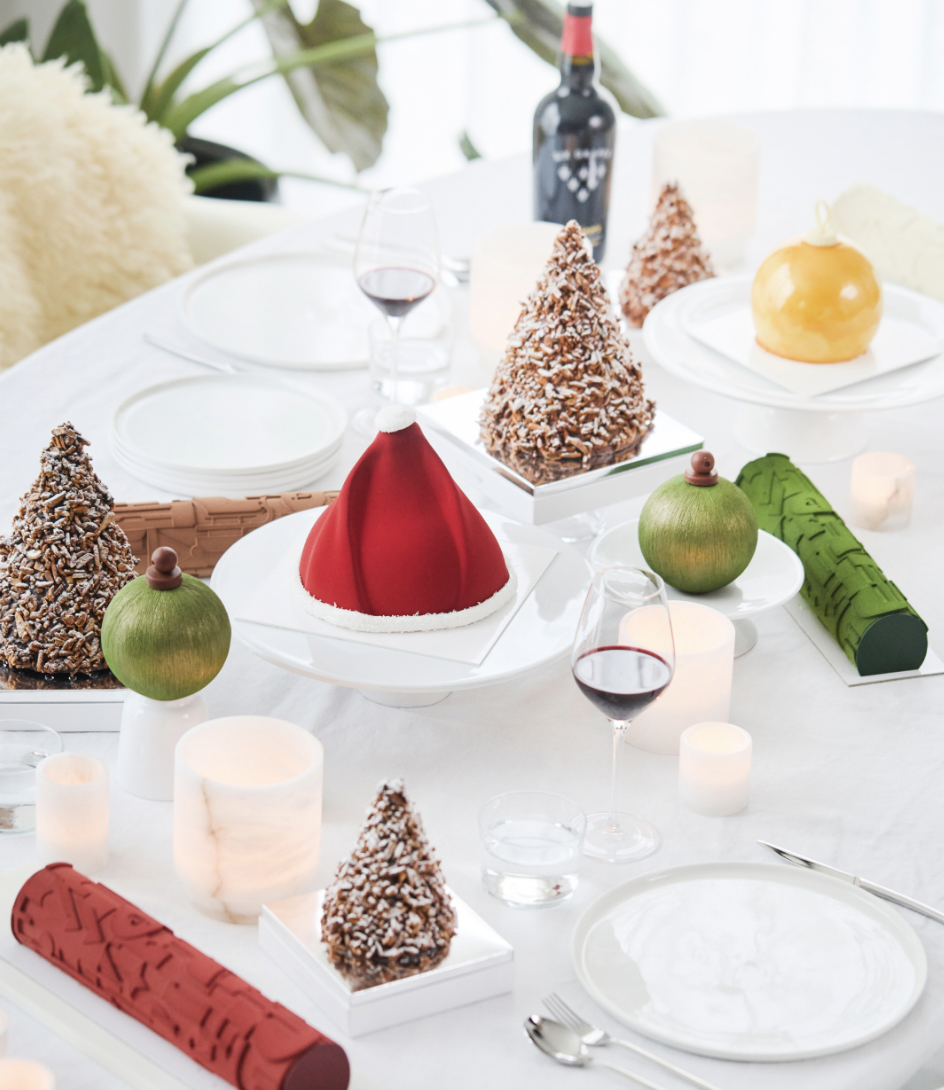 En voilà une table bluffante! Boule de Noël à croquer, bonnet rouge comestible, sapins chocolatés et bûches graphiques au design contemporain: vous offrir une création de ce pâtissier gantois, c’est la garantie de couper le souffle à vos convives.