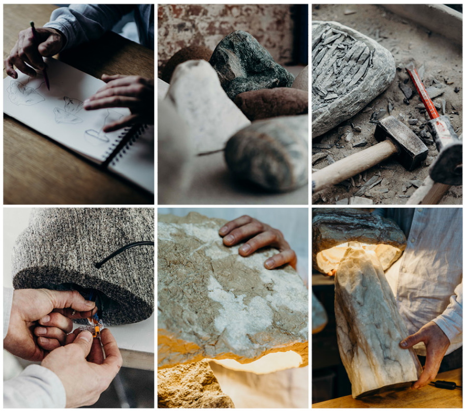L’impact de son déménagement se ressent déjà dans son travail. «Je n’ai pas arrêté une seconde. J’ai une nouvelle idée pour réutiliser les déchets de pierre, qui commencent à prendre forme. Et en même temps, j’explore quelles voies je peux encore emprunter avec les Cairn Lights. Après ces premières lampes de table, je veux aussi créer des versions monumentales sur pied, ainsi que des appliques murales.»