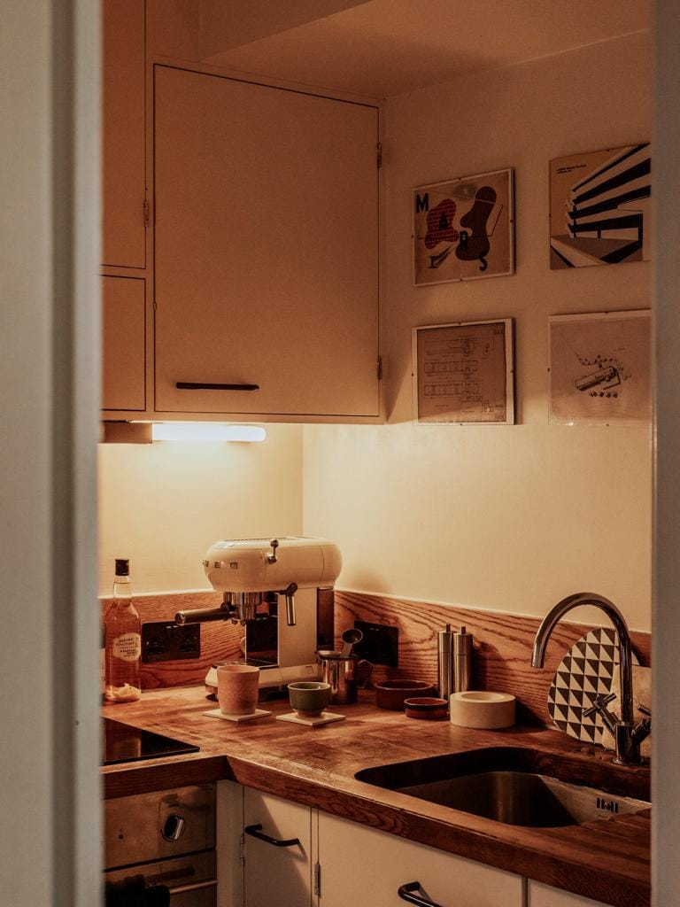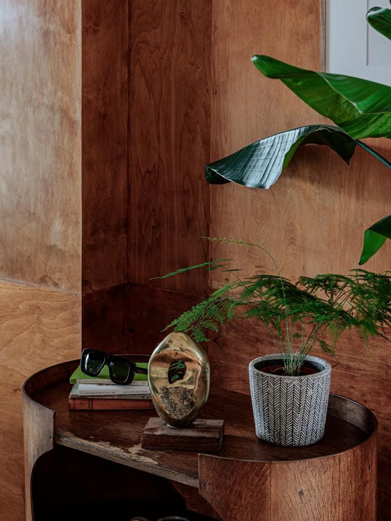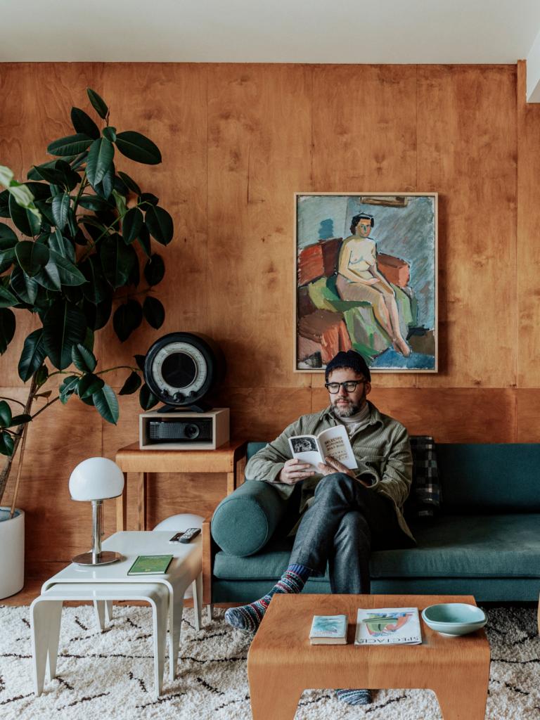 Pour Tom, cette compacité est à la fois un défi et une bénédiction. «Le plus difficile, mais aussi le plus beau, c’est d’aménager un tel lieu. Chaque objet doit avoir du sens.» Il a tenu à conserver les matériaux d’origine: le contreplaqué, patiné par plus de 90 ans d’usage, donne tout son caractère à l’espace. «Parfois, on se croirait dans une cabine de bateau.» Le mobilier prolonge l’histoire de l’Isokon, avec deux fauteuils lounge de Breuer, un canapé de Robin Day et un range-revues Penguin Donkey spécialement conçu pour accueillir les célèbres livres de poche Penguin. Quelques accents contemporains s’y ajoutent, dont une lampe de Michael Anastassiades.