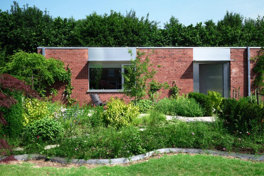 Au bout de l’allée, en apercevant un hangar en briques rouges, nous savons que nous sommes au bon endroit. Nous découvrons un écrin de verdure foisonnant, c’est le jardin de Betty (68 ans) et de son mari. Un petit sentier sinueux mène à la porte d’entrée en aluminium. «Tout le monde est surpris en arrivant ici, raconte notre hôte du jour. Et ça me plaît. De loin, on dirait un simple entrepôt, alors les gens s’attendent à tout sauf à cela.