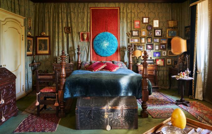 Voir ses œuvres colorées s’intégrer à ce vieux couvent du XVIIe siècle procure une impression d’union immédiate entre deux époques. Grâce aux jeux de lumière, une chaise Margherita dorée irradie entre une cheminée en marbre et d’anciennes cartes marines. Au plafond à caissons de la salle à manger, pend Brilli, l’un de ses lustres sculpturaux. La table Egeo est entourée de tapis persans et de toiles à l’huile. Dans le salon, à côté d’une collection de pots d’apothicaire, un Disco Millefili diffuse une lueur olive et citronnée au-dessus de l’âtre. Dans la chambre, la sculpture murale Tondo, un labyrinthe de fils turquoise illuminés, apporte une touche futuriste.