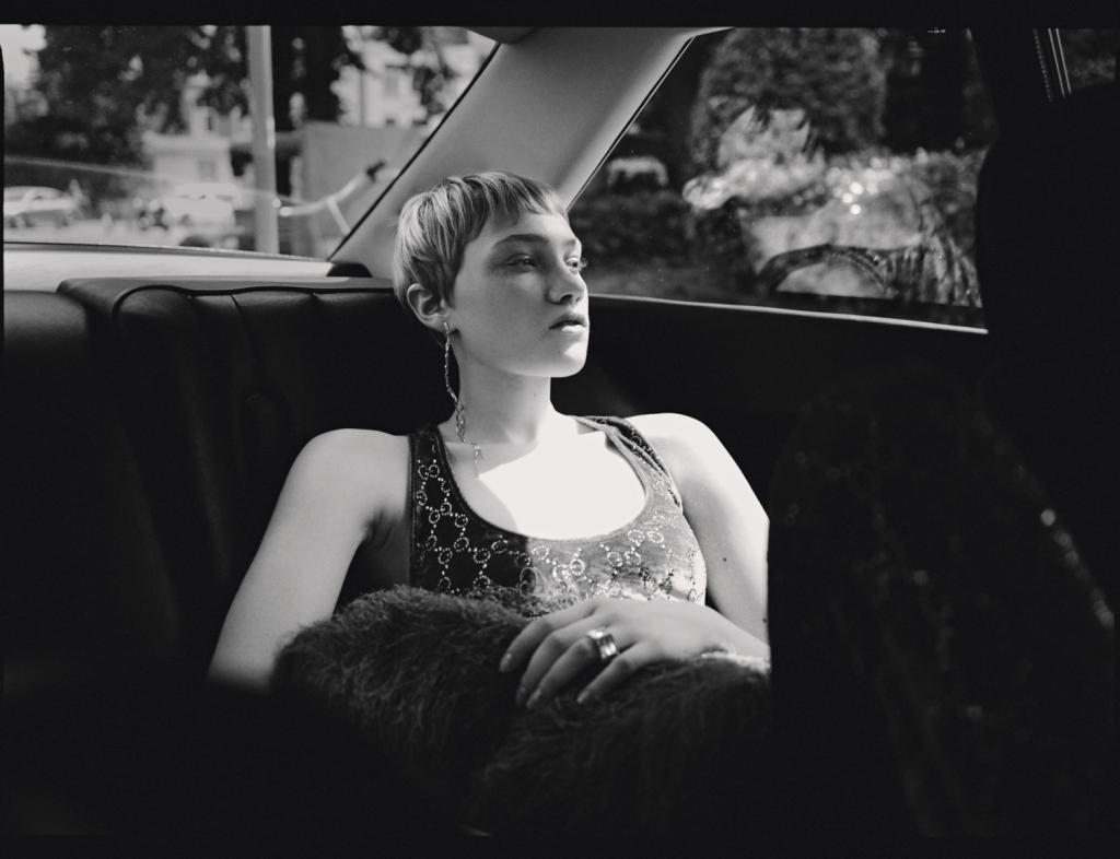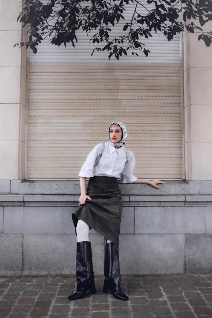 Coiffe argentée, Claudia Latruwe. Sac à dos en cuir gris et bottes en cuir noir, Coperni. Jupe crayon en suède, Max Mara. Bagues en argent, Lore Van Keer. Collants blancs, Falke.