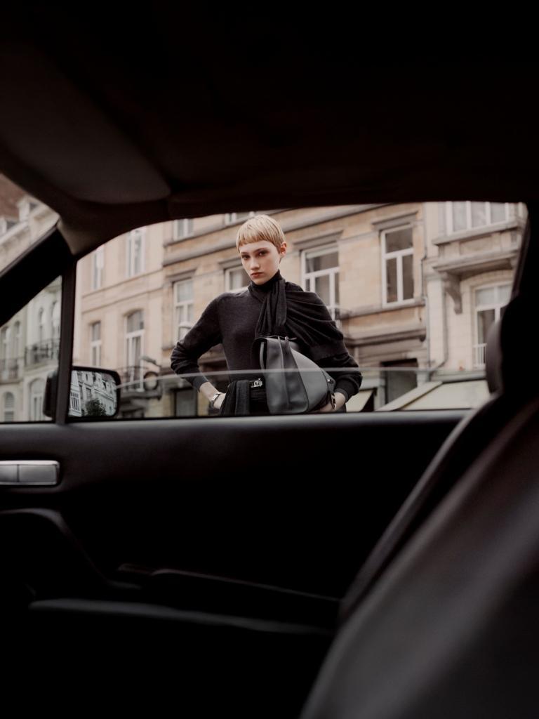 Sac en cuir gris, Delvaux. Ensemble en cachemire gris foncé, fine ceinture et bracelet en cuir, Hermès.