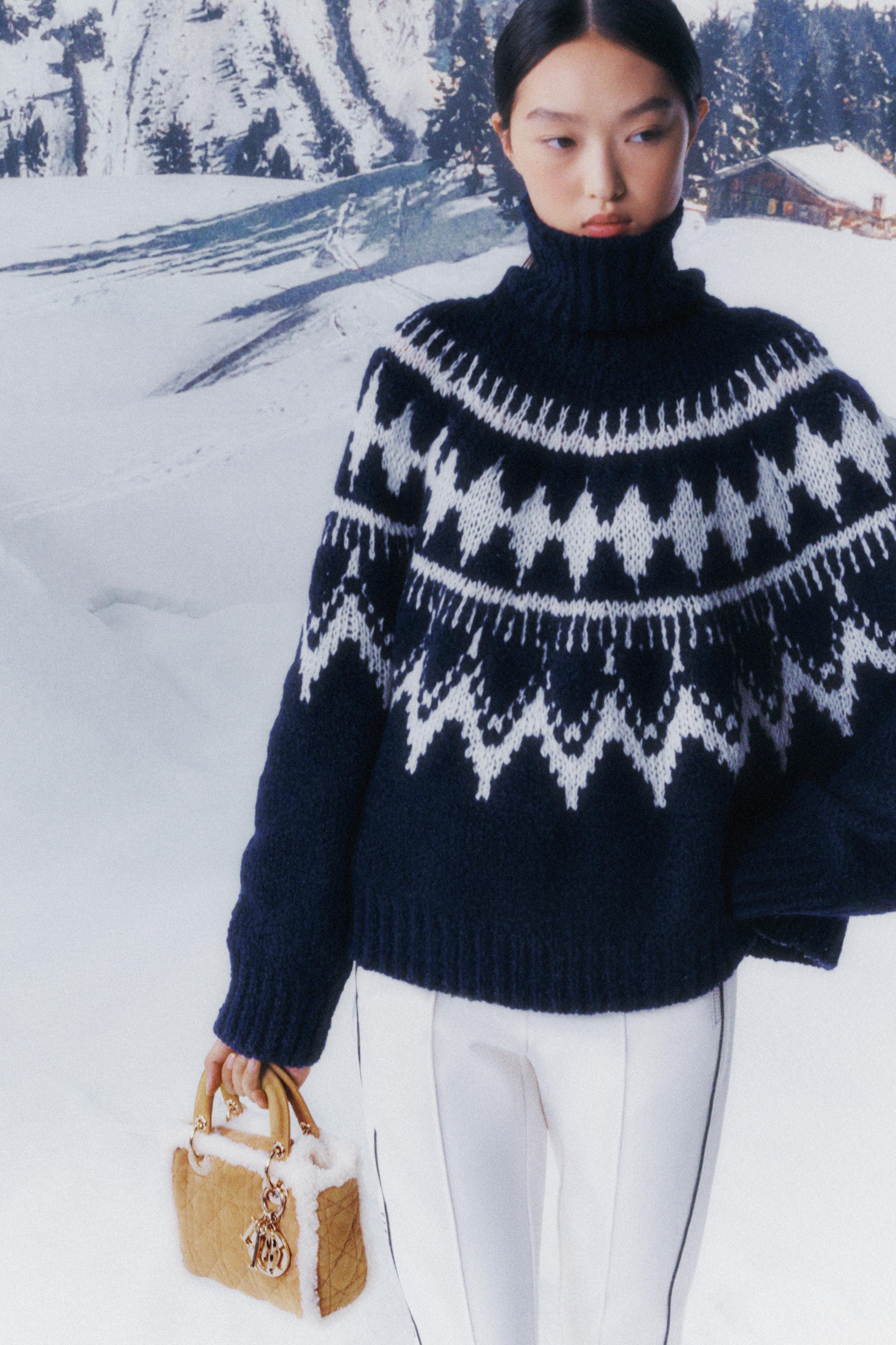 Doudounes, vestes et bottes après-ski sont agrémentées d’accessoires éminemment désirables, entre lunettes de ski à sangle, bob et gants, rehaussés ici et là de l’emblématique motif Dior Oblique. Le must? Les it bags parés de shearling pour l’occasion.