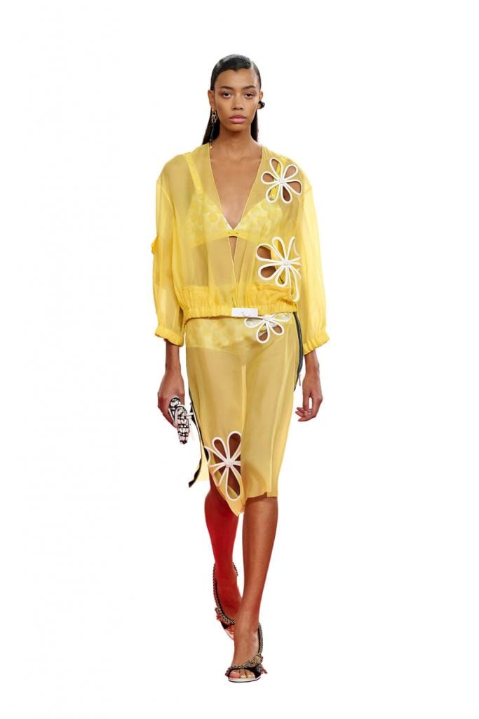 Pour son dernier défilé comme directrice artistique de la maison qui porte son nom, Silvia Venturini Fendi voulait un podium tout en couleur. Dans un kaléidoscope de tons rouges, orangés, roses et bleutés, la marguerite revenait dans presque tous les looks comme leitmotiv de cette collection: en imprimé oversize, en découpe sur les vestes et robes en cuir ou encore en breloque de sac.