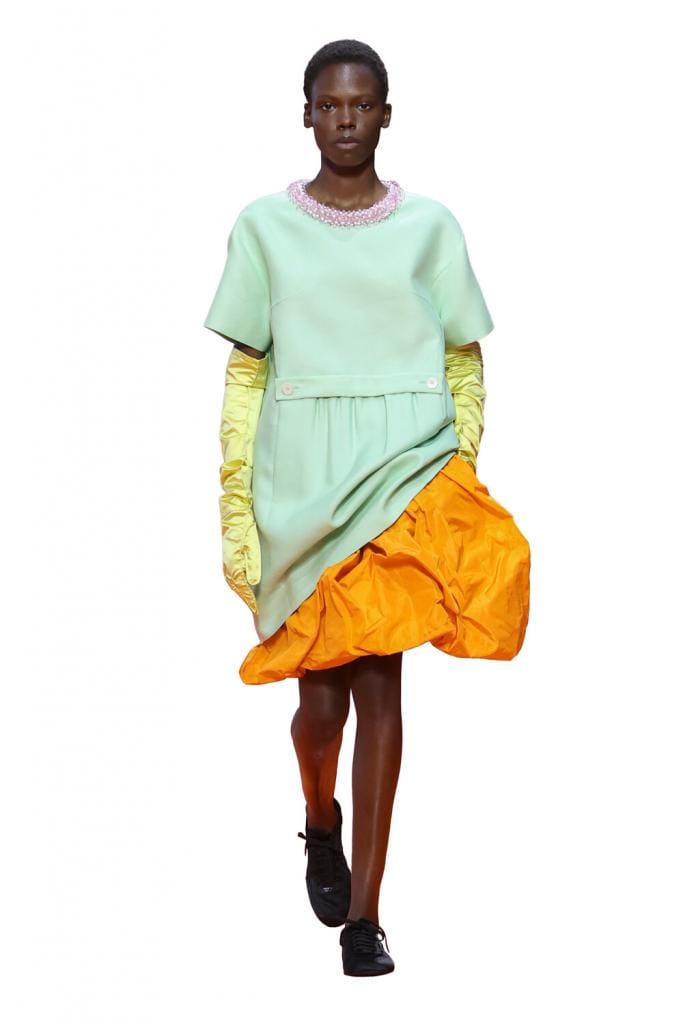 Éblouissant et orange vif: voilà planté le décor du défilé Prada, toujours l’un des plus attendus de la saison. «Nous étions à la recherche d’un nouveau type d’élégance», a déclaré Miuccia Prada au début du show. Une quête qui s’est exprimée à travers une série d’uniformes militaires, de tabliers à bretelles très longues, de jupes transparentes, de nombreux hauts qui paraissaient mal ajustés, de robes sur des jupons bouffants et de gants en cuir allant jusqu’aux coudes. Il y avait beaucoup de couleurs, le stylisme était génial. Notre conclusion générale est que l’élégance, c’est la liberté: celle de porter ce que l’on veut, comme on le veut.
