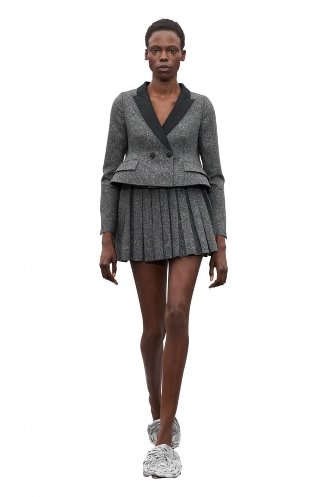 Sans doute la plus belle invitation que nous ayons jamais reçue: une assiette en porcelaine ornée de noix en 3D envoyée par Jonathan Anderson pour Dior. Le show s’est clôturé par une standing ovation, lorsque le créateur, ému, est venu saluer. On sentait la pression qui avait dû peser et le bonheur pour lui de sortir cette première collection féminine. Alors que le défilé s’ouvrait sur un film d’Adam Curtis mettant en scène tous les directeurs artistiques qui l’avaient précédé, Anderson regardait surtout vers l’avenir. On pointera une version brillamment revisitée de la veste Bar classique (avec peplum!), des nœuds et chapeaux spectaculaires, ainsi que des pantalons larges, à plis et à taille haute.