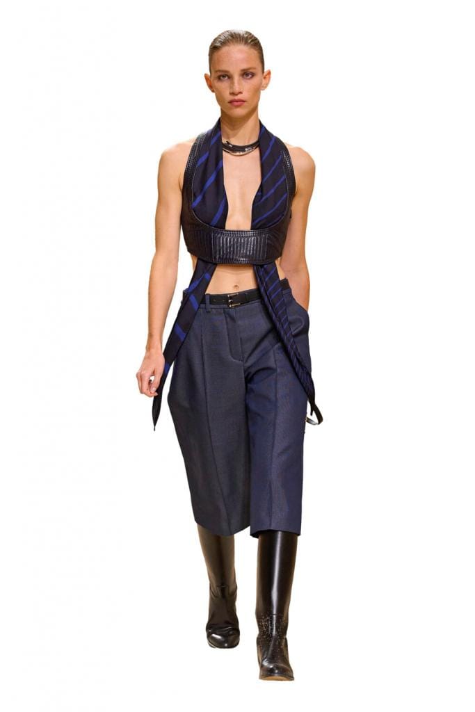Le monde équestre et Hermès sont indissociables. Personne n’a donc été surpris que Nadège Vanhée s’inspire cette saison d’une selle ancienne trouvée dans les archives de la maison. Le résultat: une collection riche en cuir souple, sangles, boucles, anneaux, vestes d’équitation et tissus matelassés, intemporelle et teintée de sensualité. Les carrés de soie, portés en tops sous des brassières en cuir, formaient le clou du spectacle.