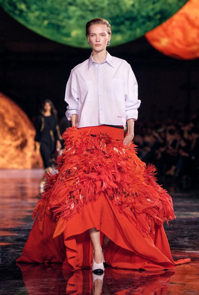 Quand tous les journalistes mode du monde regardent le défilé les larmes aux yeux, c’est qu’il s’agit d’un coup de maître. Inutile d’en dire plus sur les débuts de Matthieu Blazy chez Chanel: ce fut magnifique, du début à la fin. Il a redonné vie à la maison en revisitant ses codes de façon ingénieuse et contemporaine. Fini les tailleurs bouclés et les doubles C: place aux tweeds plus masculins, pantalons amples et chemises simples – une collaboration avec Charvet –, tombant sur des jupes à volants.