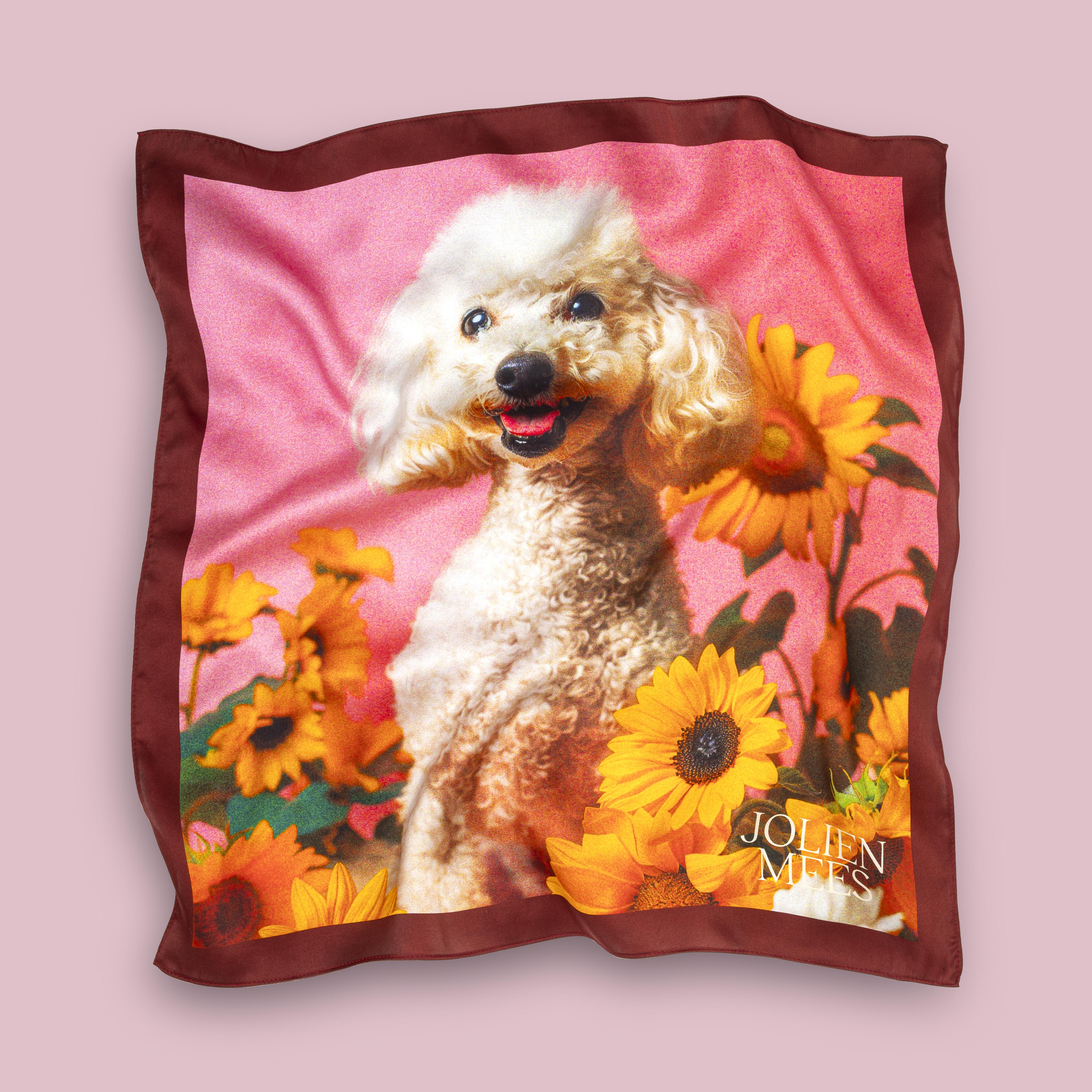 La mini-collection de foulards en soie de la créatrice de bijoux Jolien Mees rend hommage à l’amour des animaux, avec notamment un modèle où un fier caniche s’affiche avec panache, et une version panthère accompagnée de la devise «Let the Beast Out».