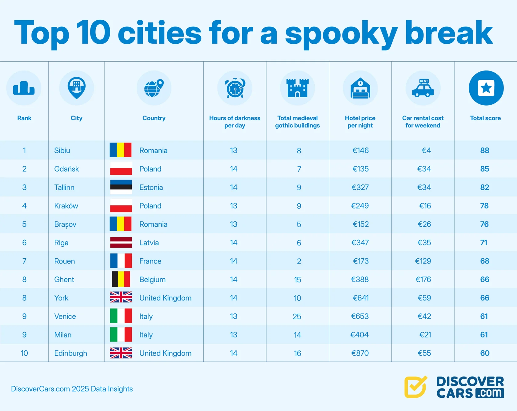 Fans d’Halloween ou de lieux à l’atmosphère gothique, le classement du comparateur de location de voitures DiscoverCars.com pourrait bien vous aider à choisir votre prochain citytrip automnal.