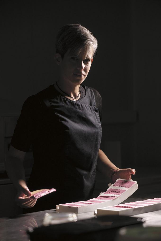Dans un pasteurisateur, Katrien porte la masse de matières premières à une température de 80 °C. Elle laisse ensuite reposer le résultat dans le réfrigérateur pendant quatre heures, un processus de maturation permettant d’obtenir un produit final plus compact. Dopée à la créativité, Katrien s’est très vite lancée dans la quête de nouvelles combinaisons de saveurs. «Quand j’étais dans la restauration, je donnais au personnel un jus booster à base de concombre, de gingembre, de céleri et d’une touche de citronnelle juste avant le service. J’ai converti cette mixture en une préparation pour crème glacée, en y ajoutant de la poire pour la touche sucrée. J’ai baptisé cette glace-là Pretty Confused, et elle se marie parfaitement avec des huîtres, du hareng ou des coquilles Saint-Jacques… par exemple.»