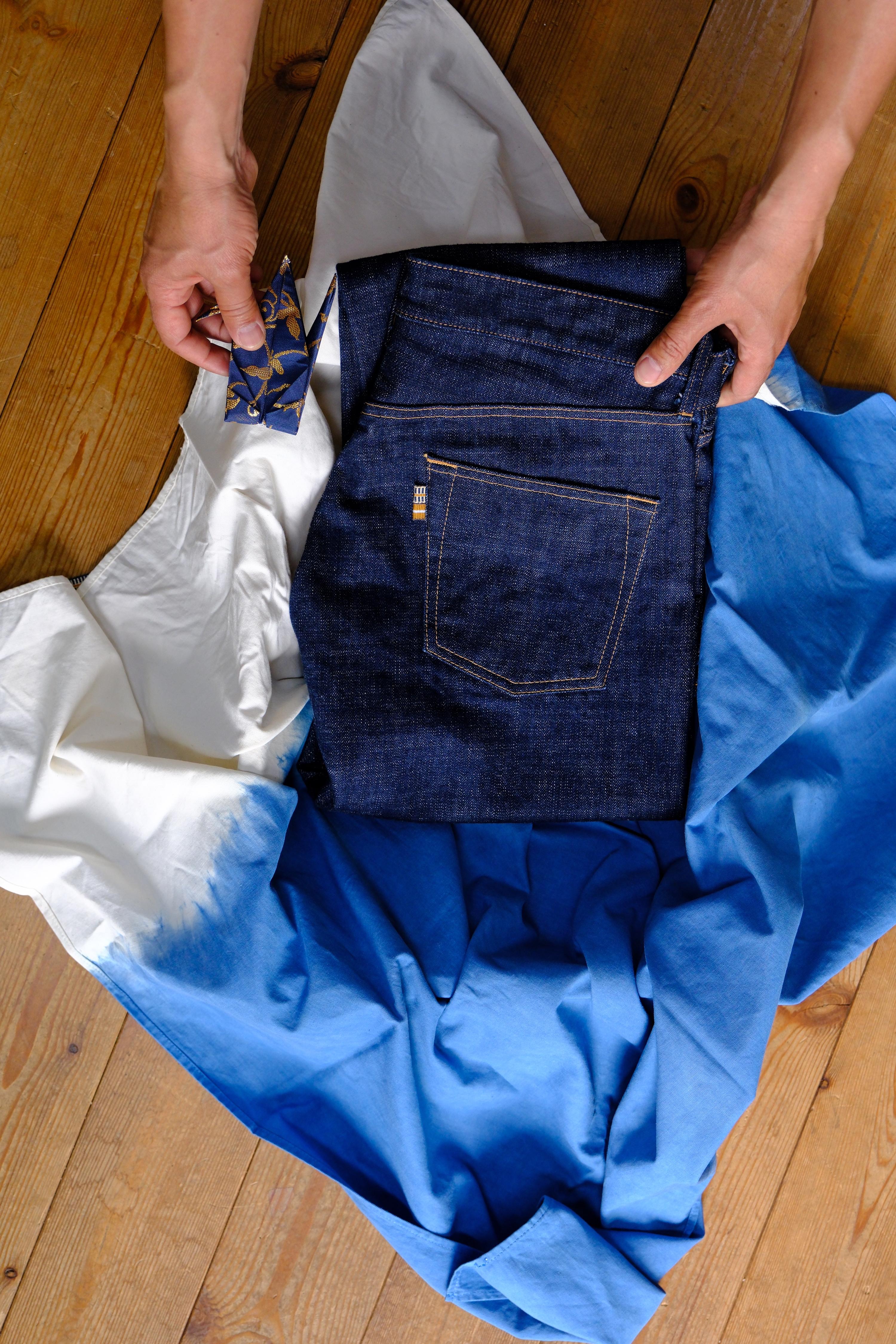Si, à force d’être porté, votre jean BoleeGa s’use au point de laisser apparaître des fils blancs, vous pouvez le renvoyer pour réparation. C’est ce que symbolise la grue en brocart. Mais tout le reste de l’emballage de votre jean sur mesure est aussi un hommage à l’artisanat japonais. Le pantalon est enveloppé dans un furoshiki traditionnel, cette étoffe utilisée pour empaqueter les cadeaux − celui de BoleeGa est teint à la main à l’indigo. Le tout est glissé dans une boîte étonnamment légère.