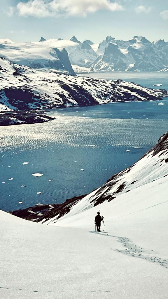 La perle du sud est enfin atteinte: le fjord Prince Christian Sund. De part et d’autre de ce dernier, des murailles de granit se dressent à pic, entaillées par des langues glaciaires qui descendent lentement de l’intérieur des terres vers la mer. L’eau bleu profond n’est pas encore complètement prise et la météo est idéale pour le kayak. On enfile nos combinaisons. Le froid pique à travers les gants, les doigts picotent. Nous pagayons à distance prudente d’un glacier imposant, sculpture laiteuse qui gémit sous son propre poids. De gros flocons de neige voltigent. Le Groenland n’est pas une destination que l’on coche, c’est une expérience qui continue de vibrer longtemps.