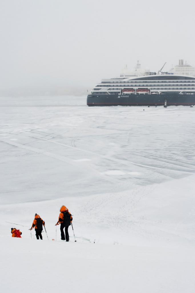 Encordés, nous escaladons rochers moussus et pentes glacées, nous nous enfonçons parfois jusqu’aux hanches dans la poudreuse. Une passagère chinoise glisse en tentant un selfie; son iPhone disparaît dans une fissure. «La distraction peut être fatale ici. La concentration est primordiale», sermonne Ludo. Après quelques heures, nous atteignons le sommet, fourbus et en sueur. Le soleil perce. En contrebas, notre navire semble minuscule, immobile et prisonnier de la glace. La magie opère.