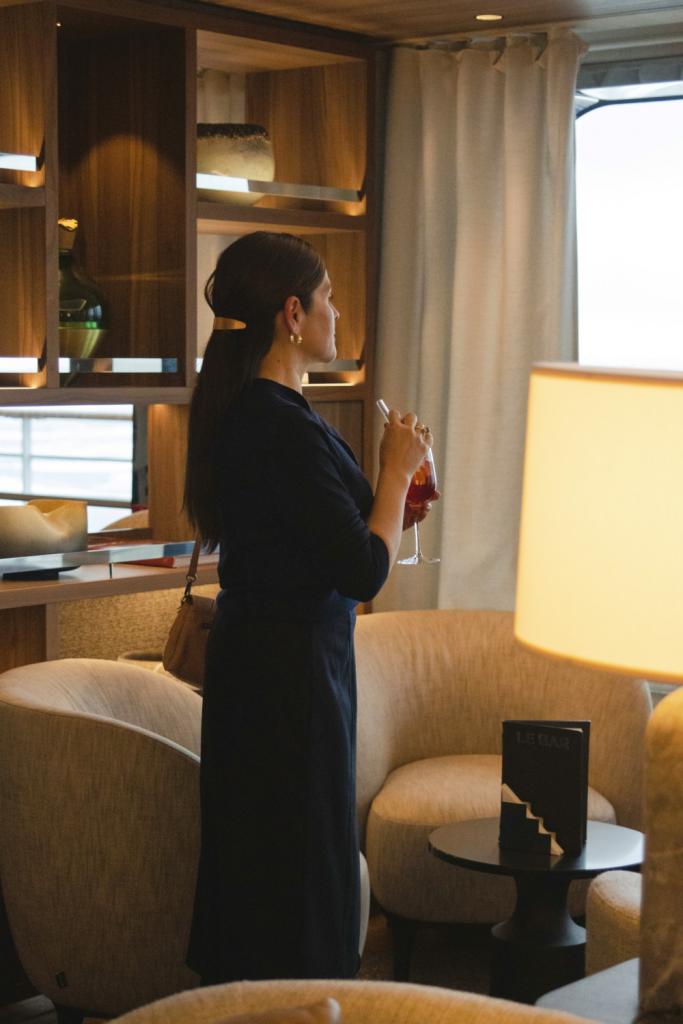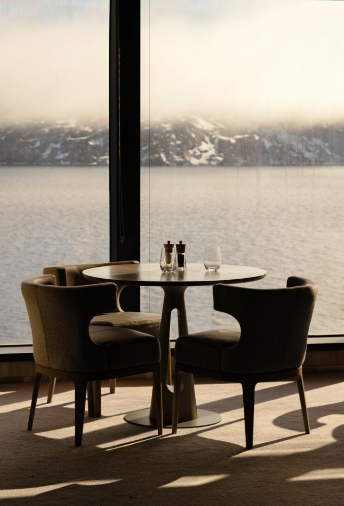 Le soir, le restaurant Nuna ouvre ses portes et propose un consommé clair de légumes, carpaccio de courgettes, bar croustillant à la sauce citronnée, pommes caramélisées et glace au yaourt — tout est exécuté à la perfection. Service digne d’un étoilé. À travers les baies, les premiers blocs de glace défilent, bleutés dans la lumière du soir. Digestif servi au bar de l’observatoire, face à la proue, un saxophoniste installe une ambiance chaude et intime.