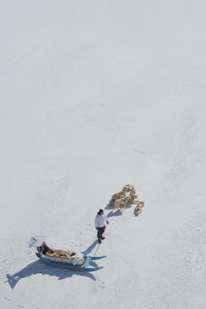 Au petit matin, le zodiac accoste à Sisimiut, une bourgade aux maisons colorées. Au loin, on entend les aboiements des chiens prêts à tracter un traîneau. Après une balade, on s’installe à quatre sur la grande luge, recouverte d’épaisses couvertures. Jens, le musher siffle et les treize chiens s’élancent. On glisse au travers d’un paysage immaculé, franchissant un lac gelé qui miroite dans la lumière du matin. Les chiens halètent et tirent de toutes leurs forces sur la pente. Leur souffle fait des nuages dans l’air piquant, si frais qu’il crépite presque. Au cœur de ce blanc absolu, le paysage subjugue par sa simplicité. Le silence est si intense qu’il en devient palpable.