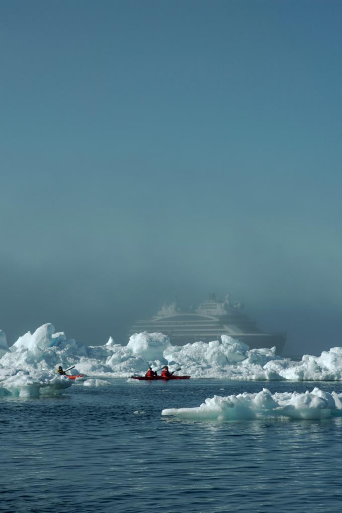 Retour à bord: nouveau craquement sourd de la glace. La brume tombe, l’atmosphère se fait plus mystérieuse. La corne retentit pour prévenir pêcheurs et chasseurs locaux, souvent sans radio. Sur l’hélideck, à nos côtés, on rencontre un couple d’aventuriers norvégien, Eli et Ariane, routards de l’Arctique. «On ne vient pas ici pour être vu, dit Ariane en souriant, mais pour voir ce que l’on ne voit nulle part ailleurs.» À peine ses mots dissipés qu’un passager crie: «Un ours!» Sur les plaques verglacées, se déplace cet animal polaire — nanoq en groenlandais. Il progresse, prudent, puissant et élégant, avant de disparaître dans la brume.